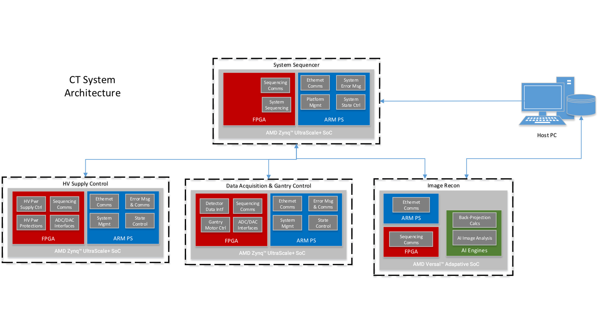 Magnetic resonance imaging (MRI) and computed tomography (CT) machines are large, highly synchronous machines that require significant computational capabilities across various subsystems. AMD adaptive SoC platforms, like Versal™ AI Edge and Versal™ AI Core series, can accelerate even the most compute intensive image reconstruction (2D FFT for MRI and back-project for CT) and help integrate ML-based image analysis.