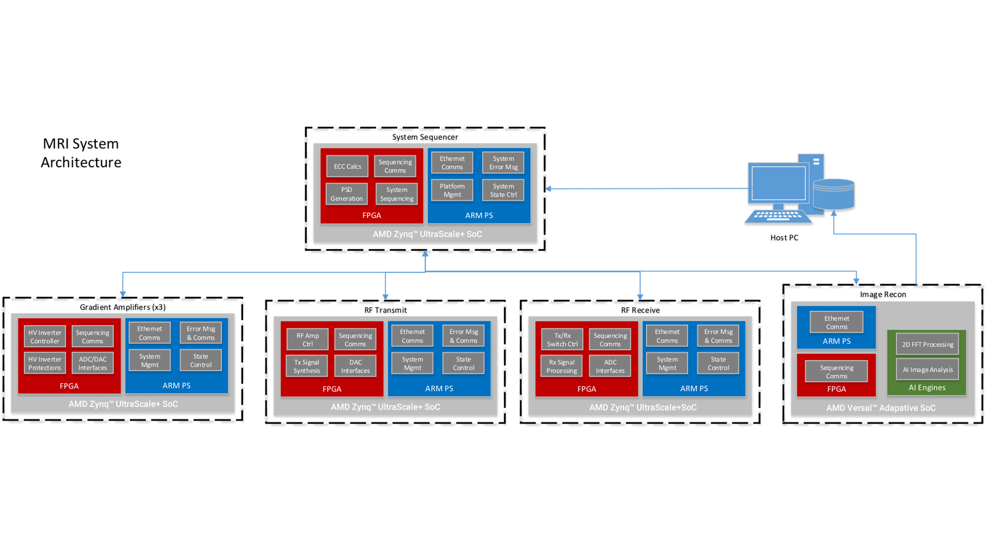 Integration with AMD Zynq™ UltraScale+™ adaptive SoCs provides a platform for the high-speed SiC inverter control required in gradient amplifiers, for the RF waveform synthesis required in RF transmit chain, and for the massively parallel ADC interfaces and signal processing required on the RF receive side. The coupling of an ARM® processing system in each sub-system enables low-latency critical communications, maintenance, and co-processing functions to be implemented in a rich OS environment.