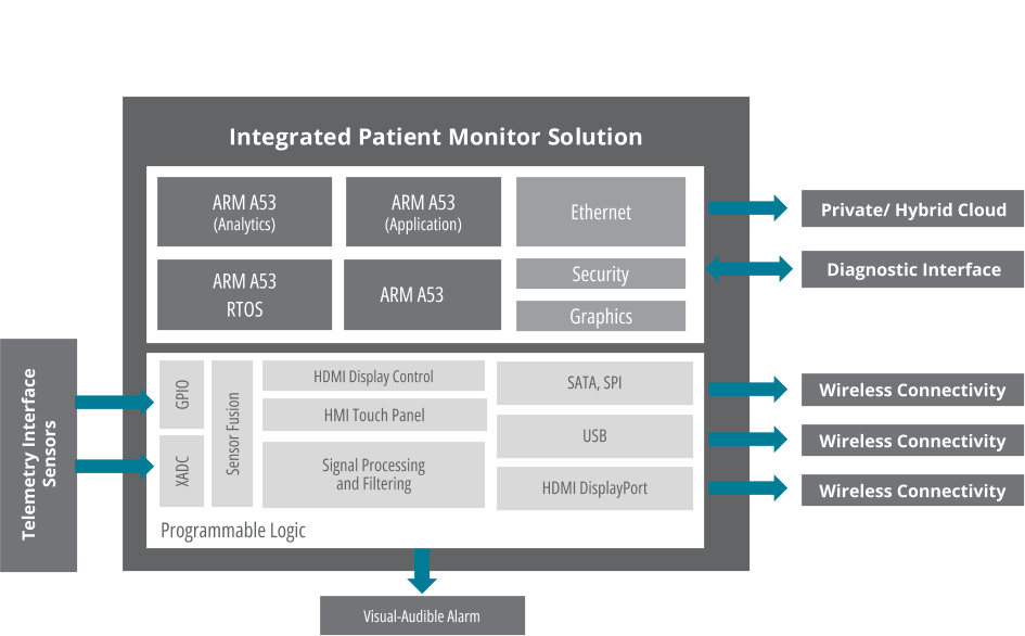 Shown here is a high-level block diagram depicting a smart, connected, high performance and low power patient monitor with a dual or quad core Zynq Ultrascale+ MPSoC, with an optimally configured fabric depending on the performance-per-watt and price/cost trade-offs.