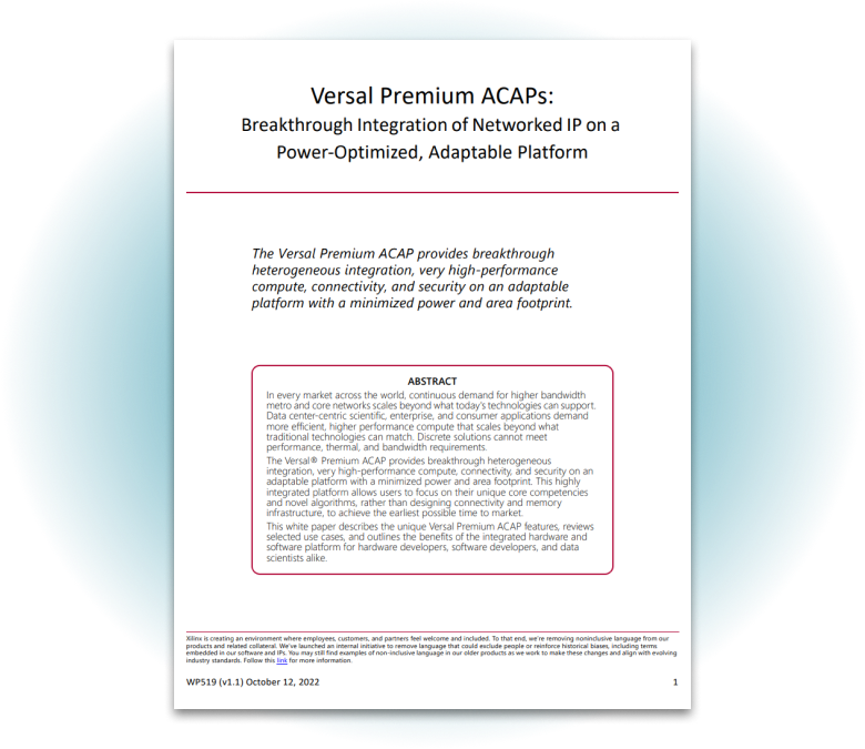 With double the compute density of traditional hardware programmable devices, Versal Premium enables hardware differentiation, adaptability to evolving standards, and the ability to infuse AI/ML for tomorrow’s autonomous and intelligent networks.